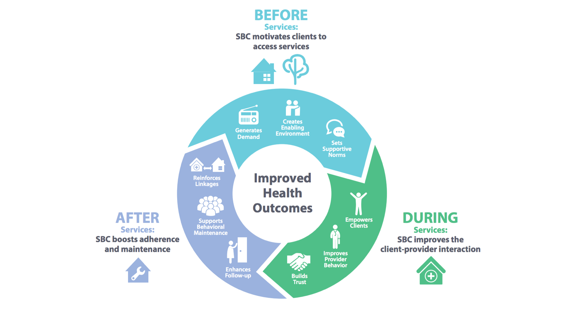 The Circle of Care is a holistic model that shows how SBC can be applied across the service continuum—before, during, and after services—to improve health outcomes.